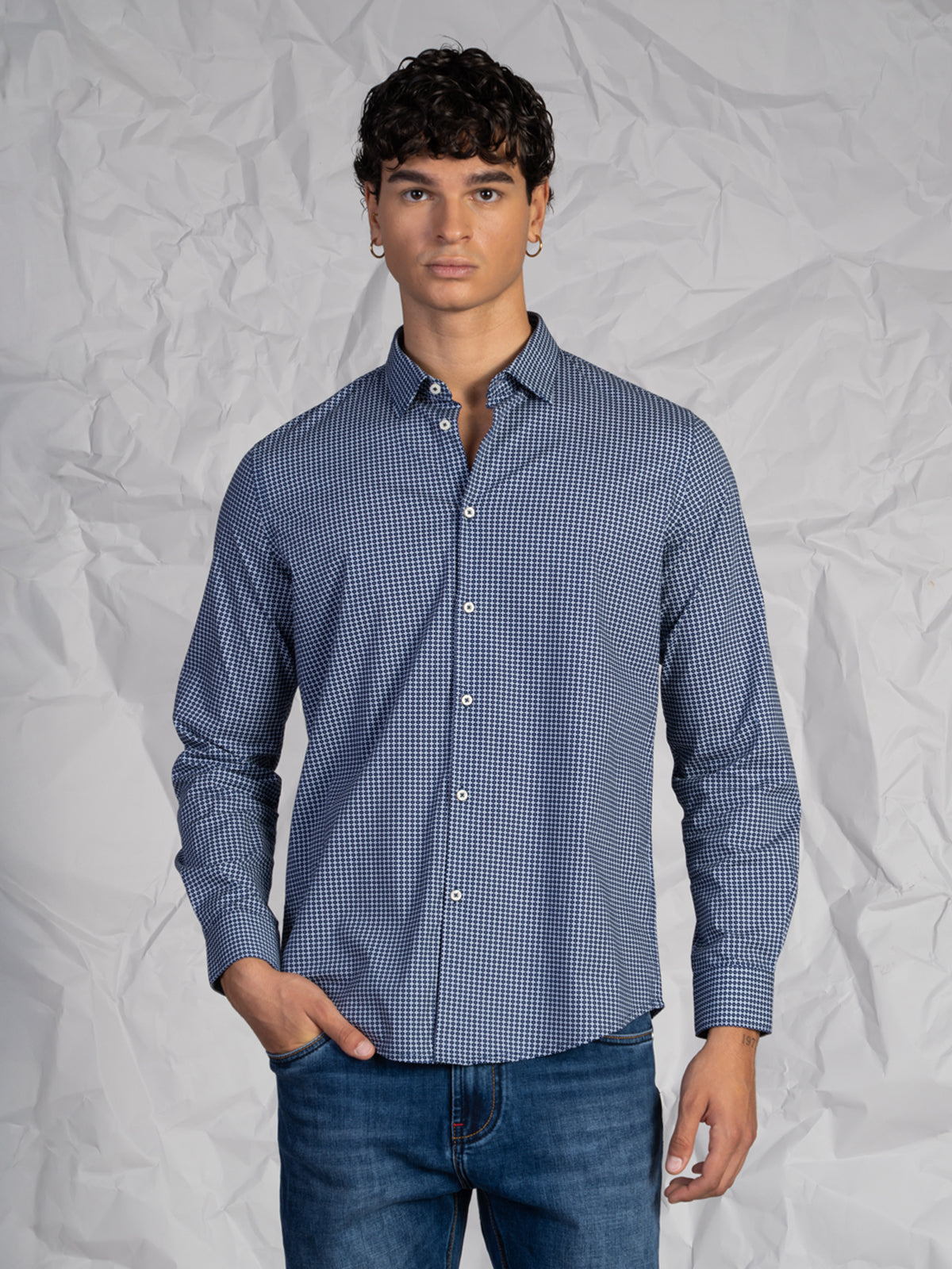 Camicia da uomo fantasia a quadretti blu, realizzata in cotone elasticizzato per offrire comfort, traspirabilità e libertà di movimento. Il collo classico e i polsini smussati conferiscono un tocco di eleganza discreta, mentre i rinforzi laterali garantiscono maggiore durata e una vestibilità sempre perfetta.