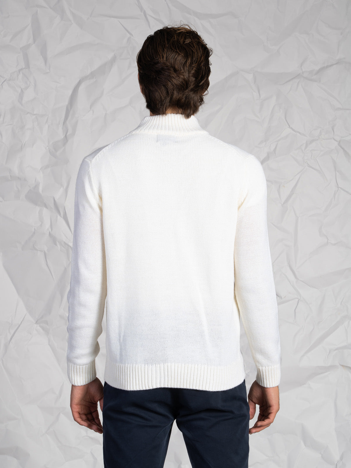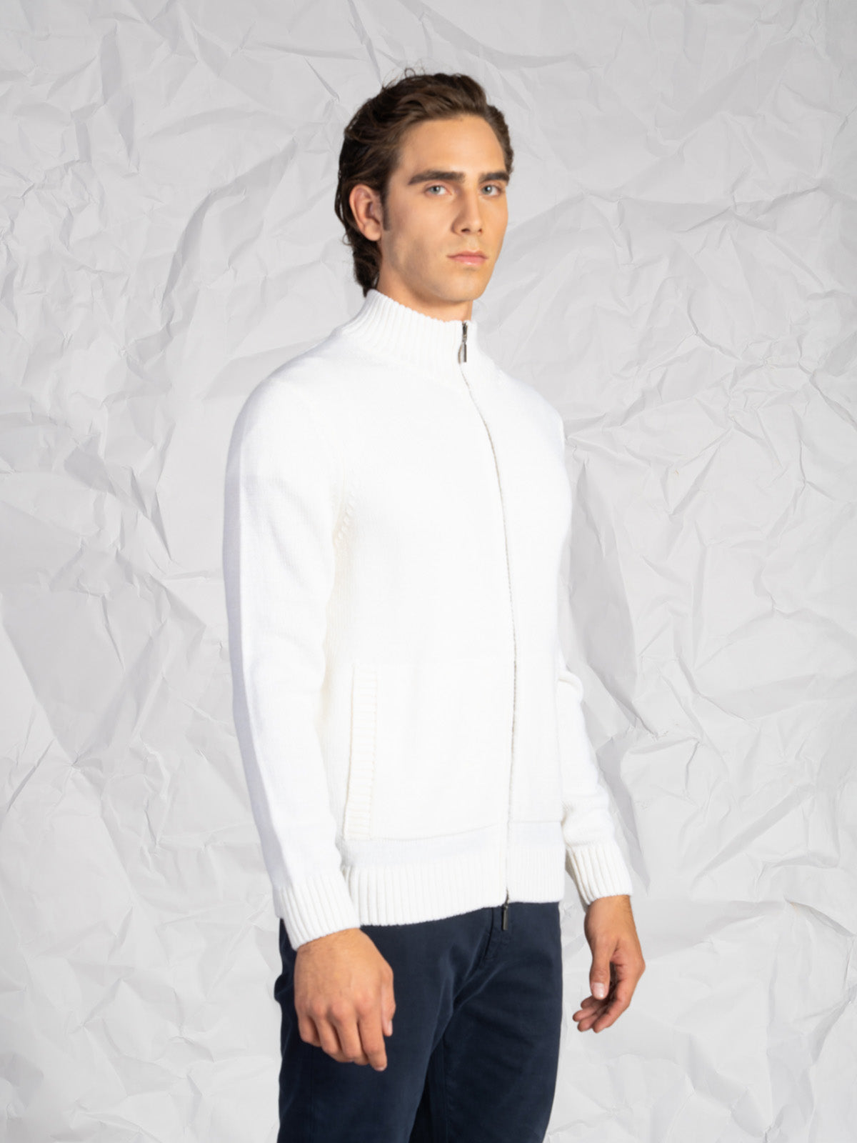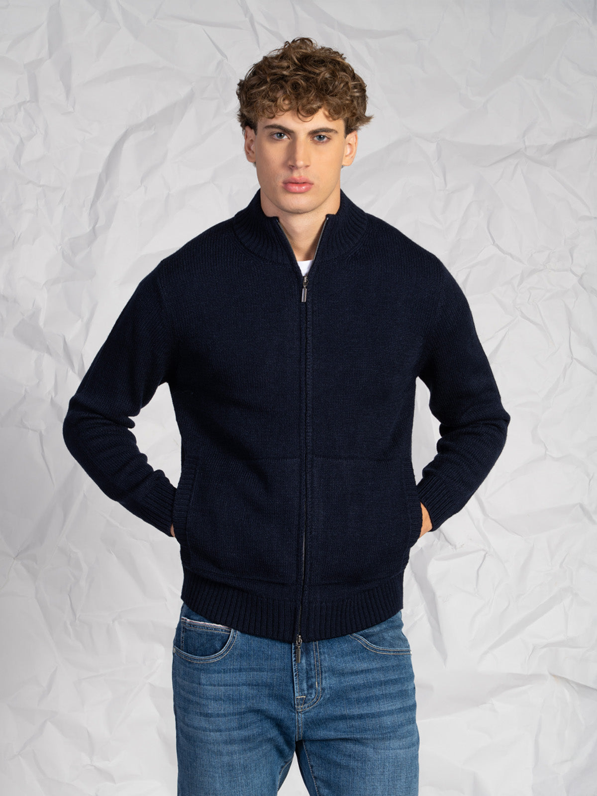 Cardigan da uomo in misto lana, morbido e confortevole, ideale per la stagione più fredda. Presenta chiusura intera con zip, due tasche laterali e bordi a coste per una vestibilità perfetta. La tinta unita lo rende un capo semplice e versatile, perfetto per ogni occasione casual o elegante.