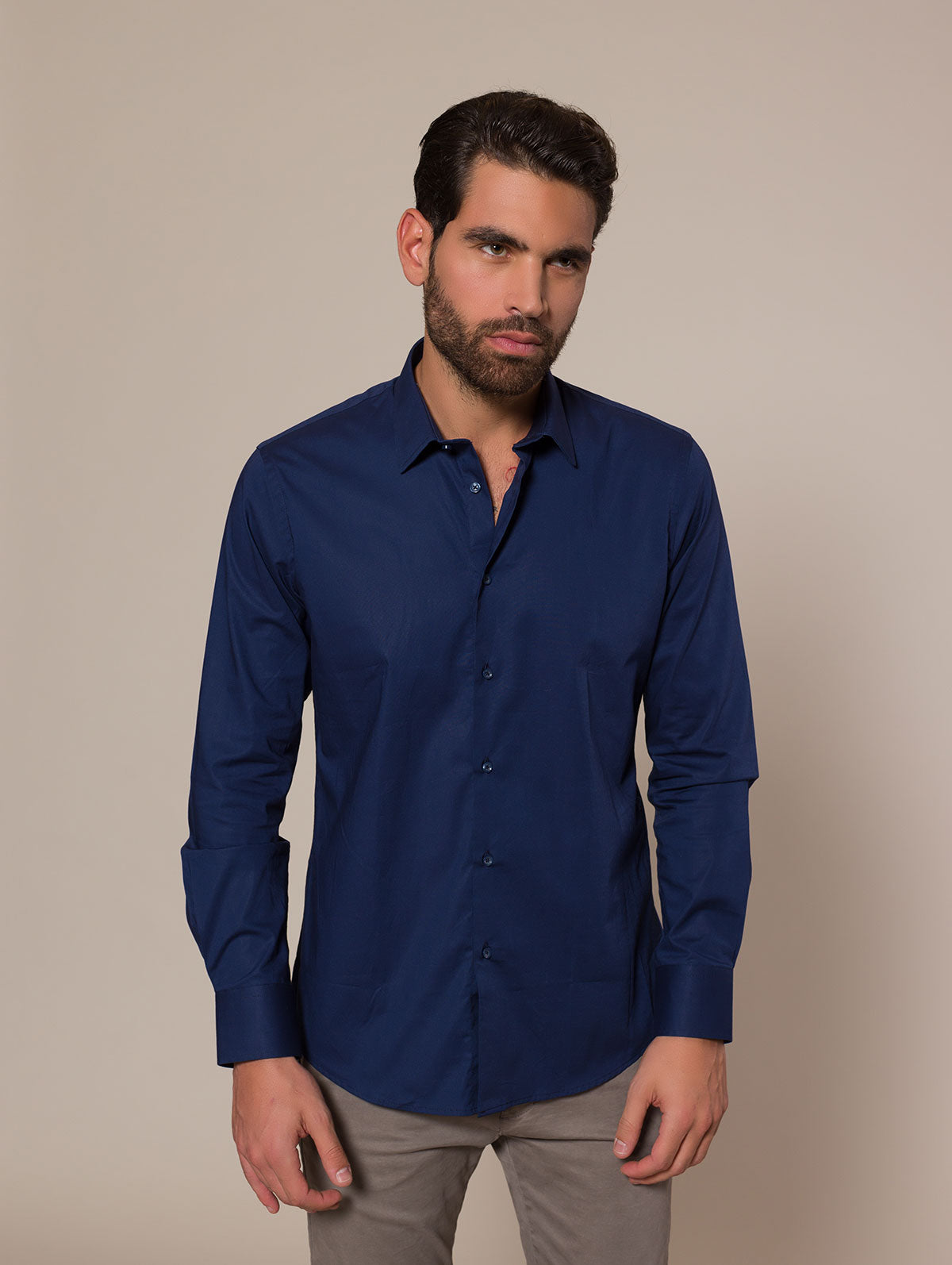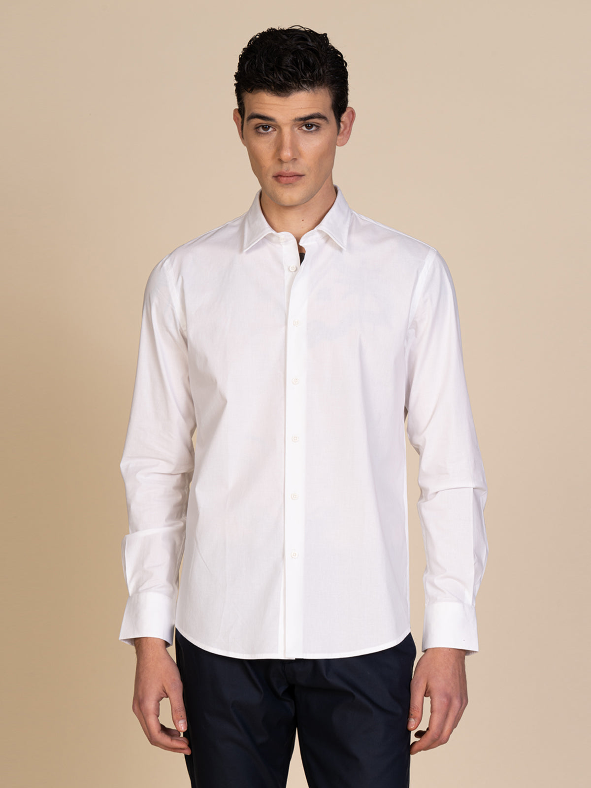 Stretch cotton shirt, classic collar, solid colour. Long sleeves with beveled buttoned cuffs and hem with side gussets.