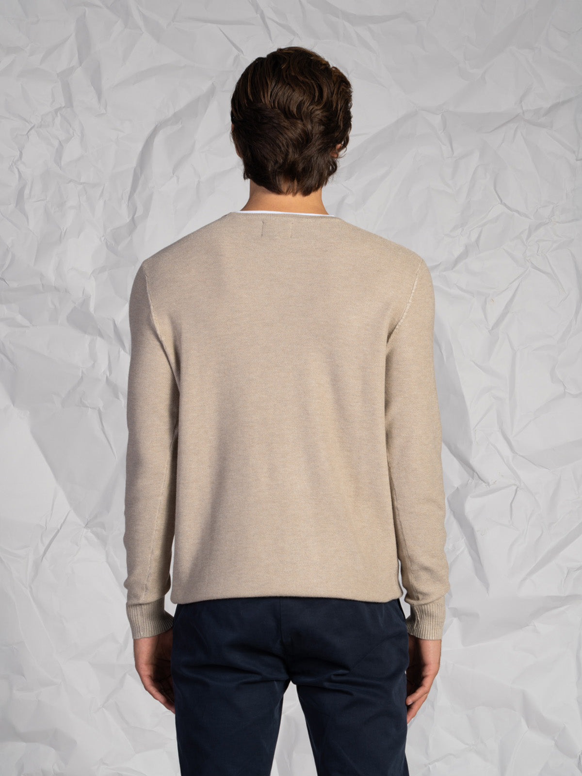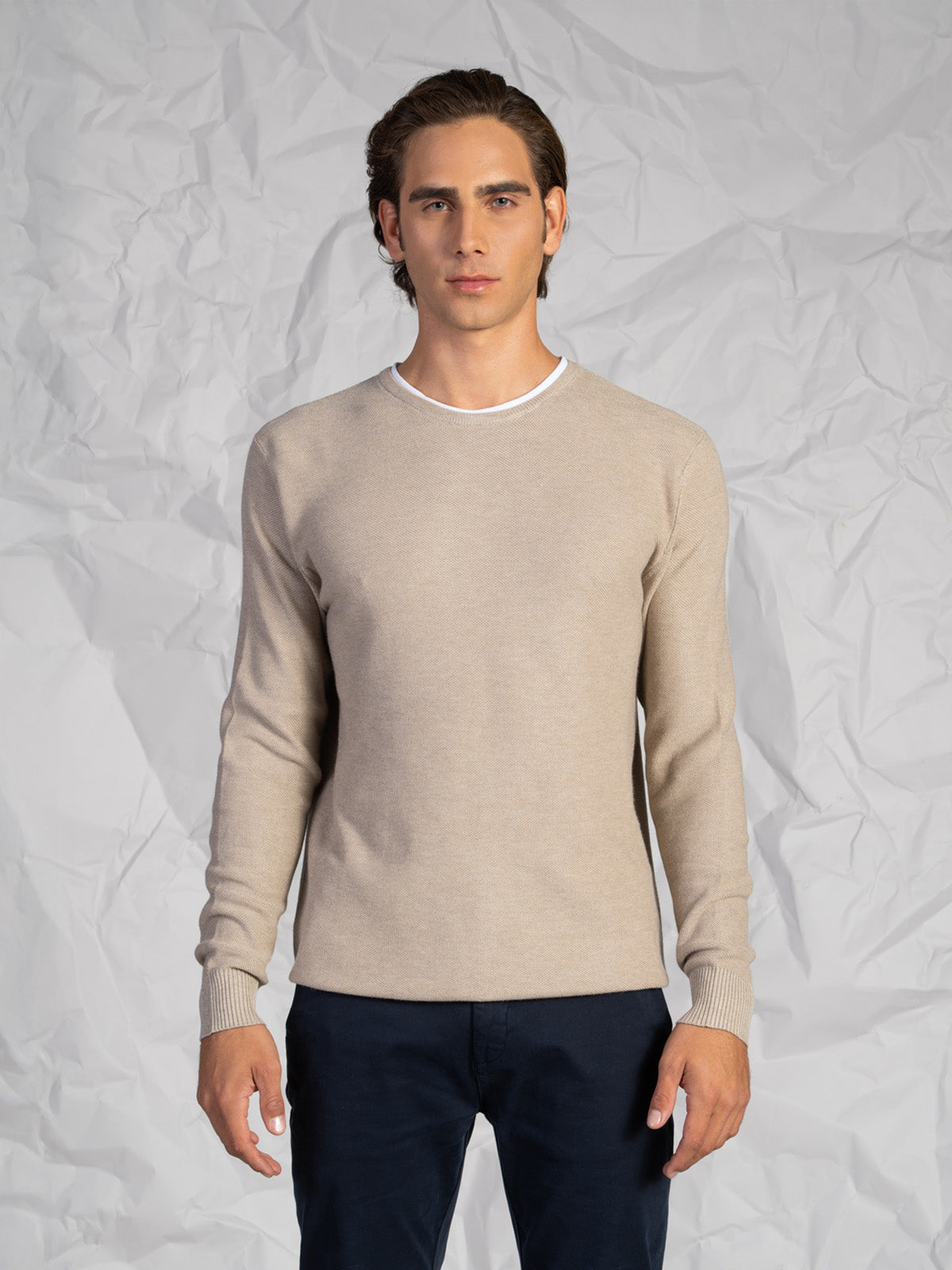 Maglia da uomo a girocollo con maniche lunghe, realizzata in tessuto jacquard dalla texture raffinata e morbida al tatto. Il doppio collo a contrasto bianco aggiunge un dettaglio distintivo e contemporaneo, che valorizza il design pulito e la linea essenziale del capo.