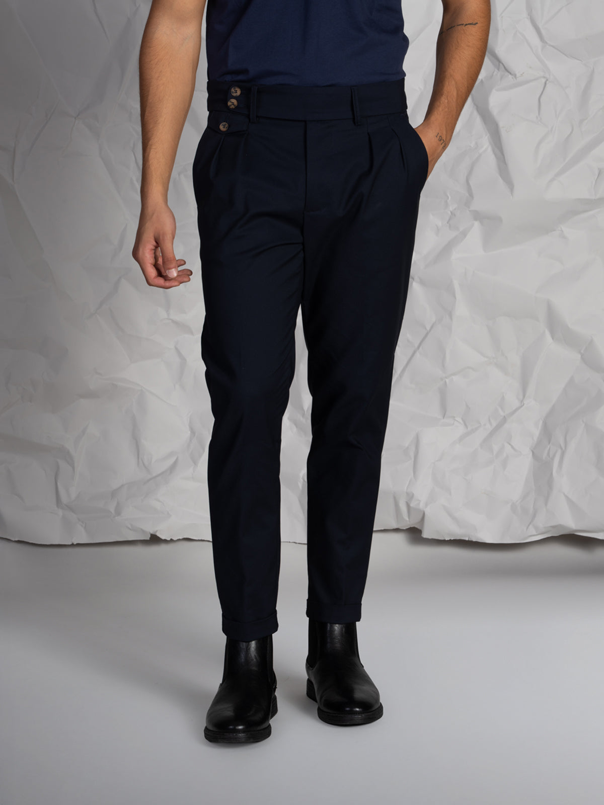 Pantaloni chino da uomo realizzati in cotone stretch, ideali per chi cerca comfort, libertà di movimento e uno stile curato. Il modello presenta tasche America sul davanti, una pence singola e un taschino con bottoncino, che aggiunge un tocco sartoriale.