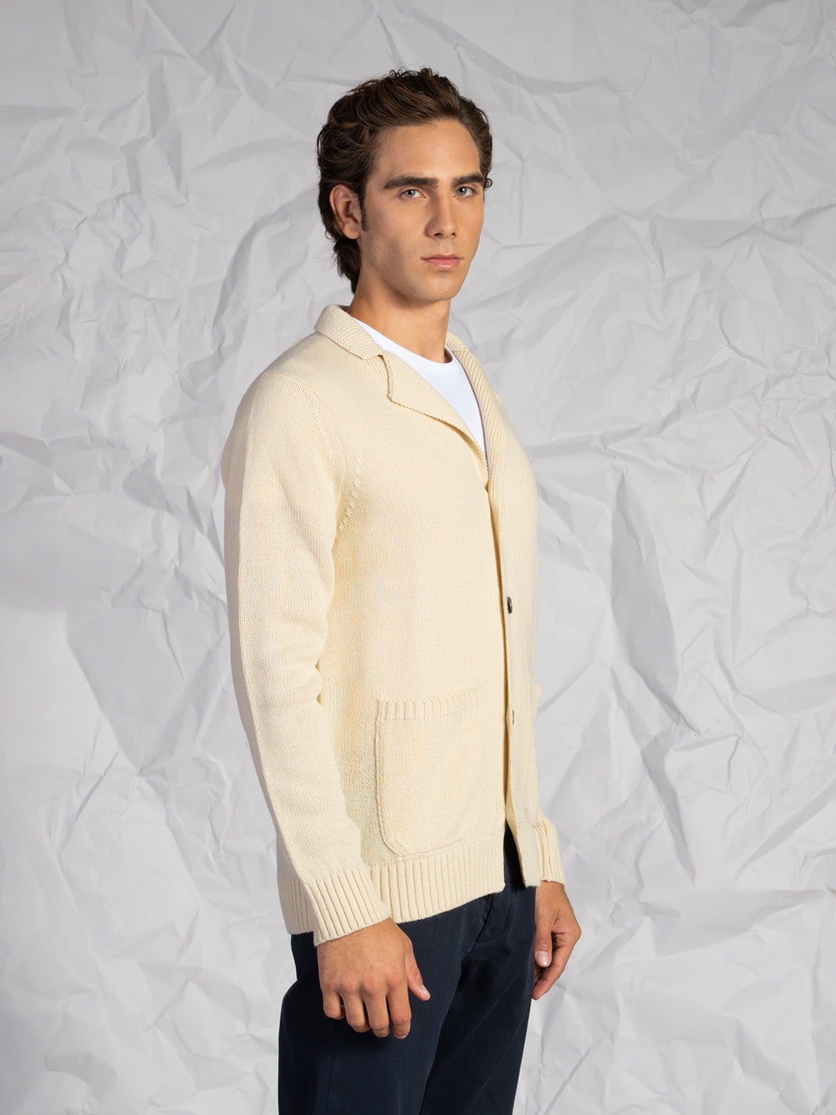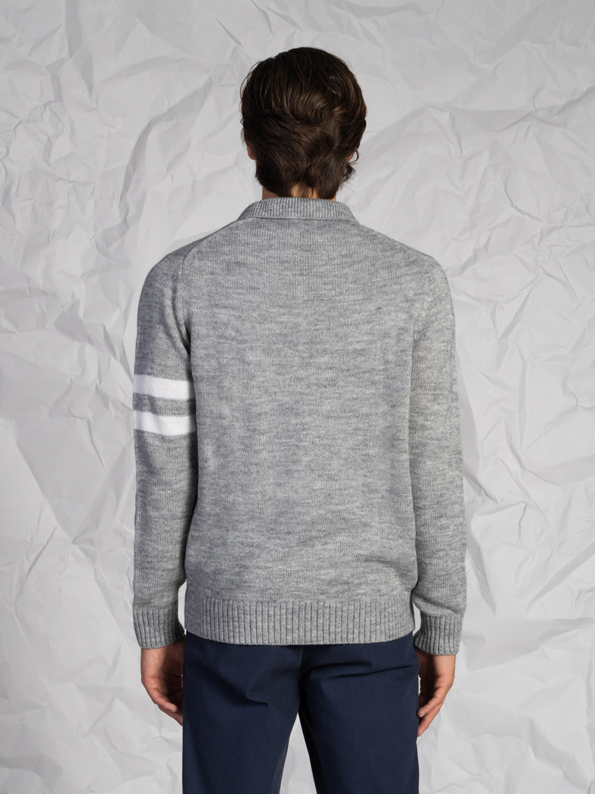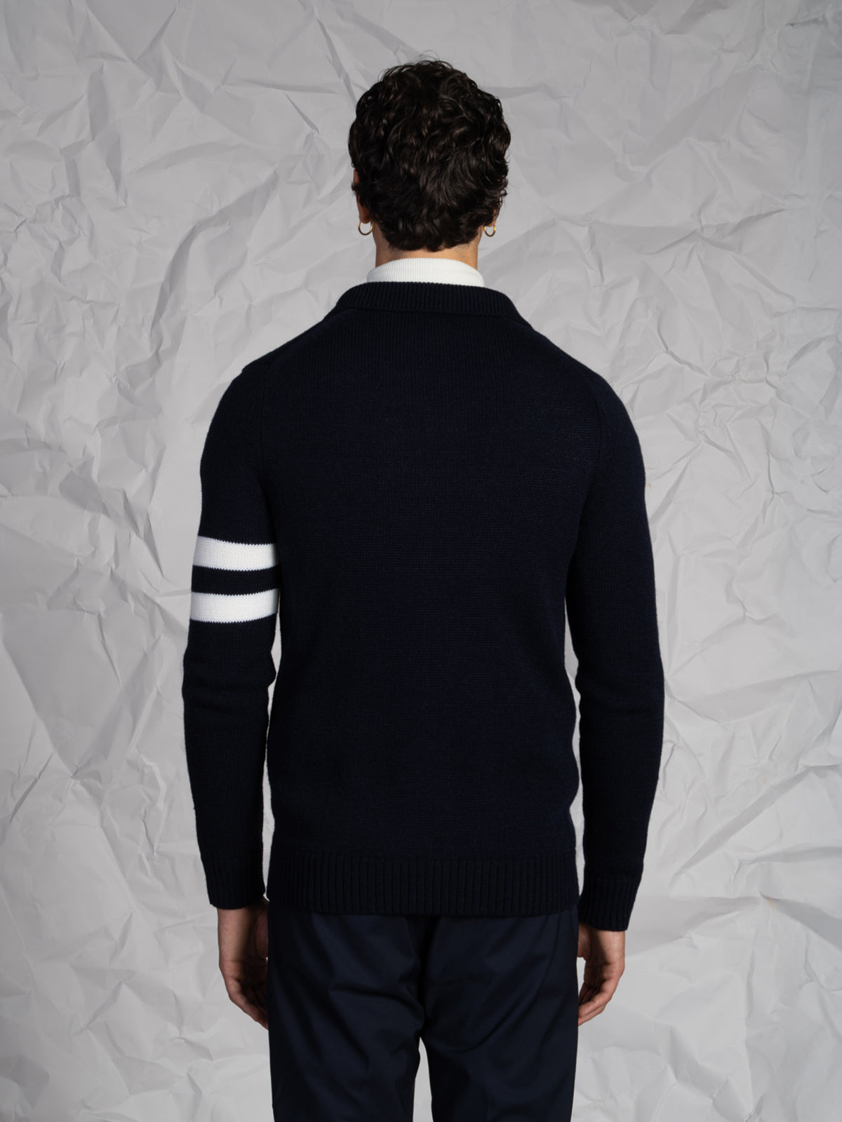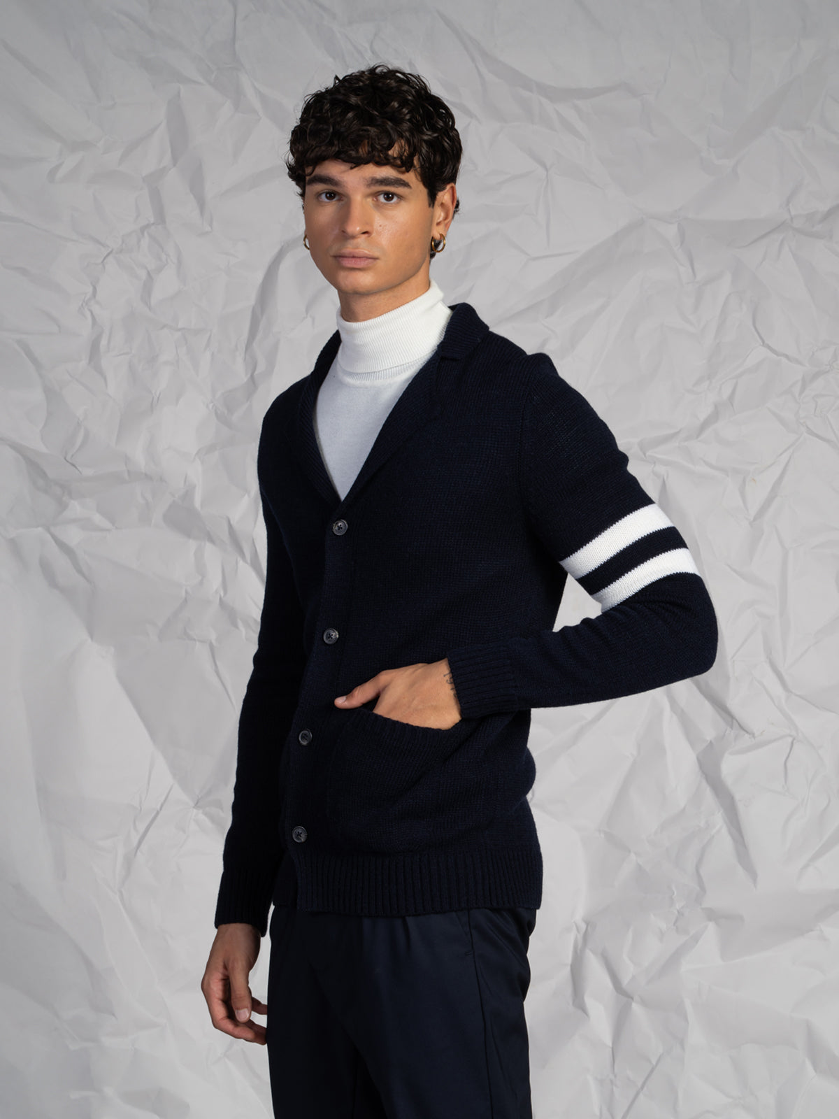 Cardigan da uomo con chiusura a bottoni e due tasche a toppa, realizzato in tessuto morbido con bordi a coste. Le bande a contrasto colore sulla manica sinistra aggiungono un tocco sportivo e moderno a un capo dal fascino classico. Perfetto per completare look casual e versatili.