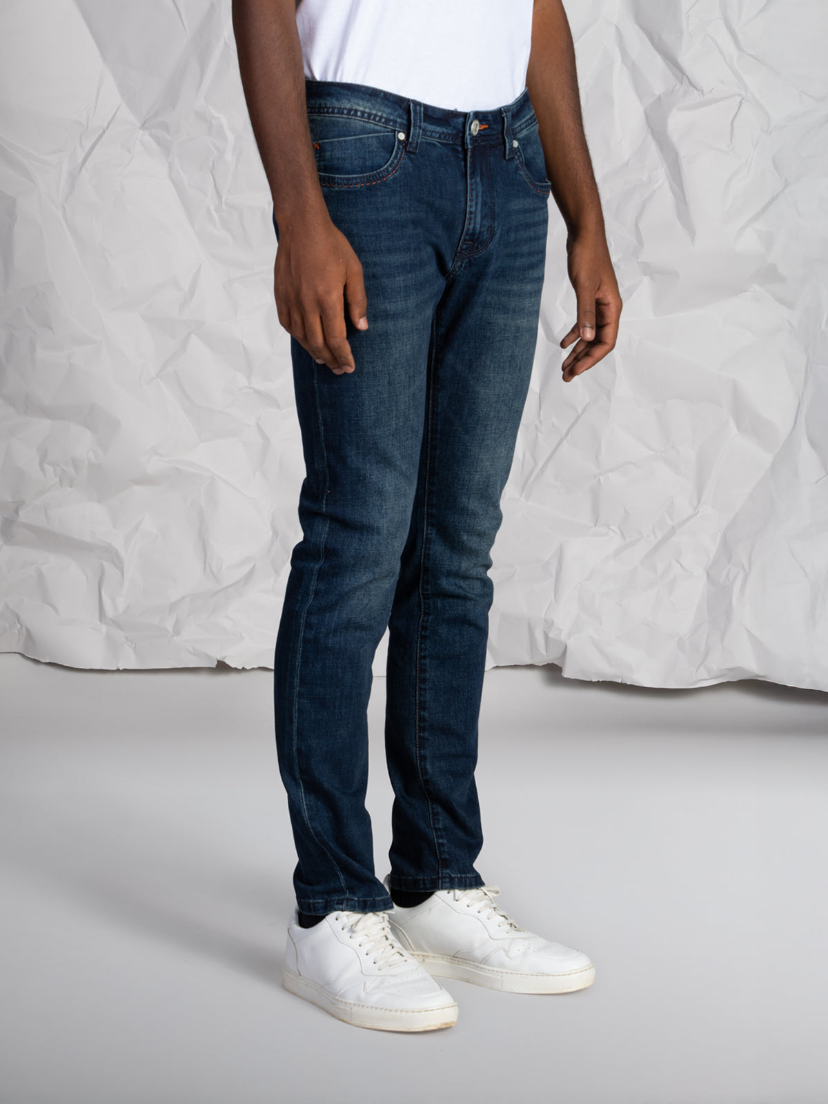 Jeans uomo DRAGONI in denim scuro elasticizzato. Slim fit e comfort quotidiano per uno stile moderno e versatile.