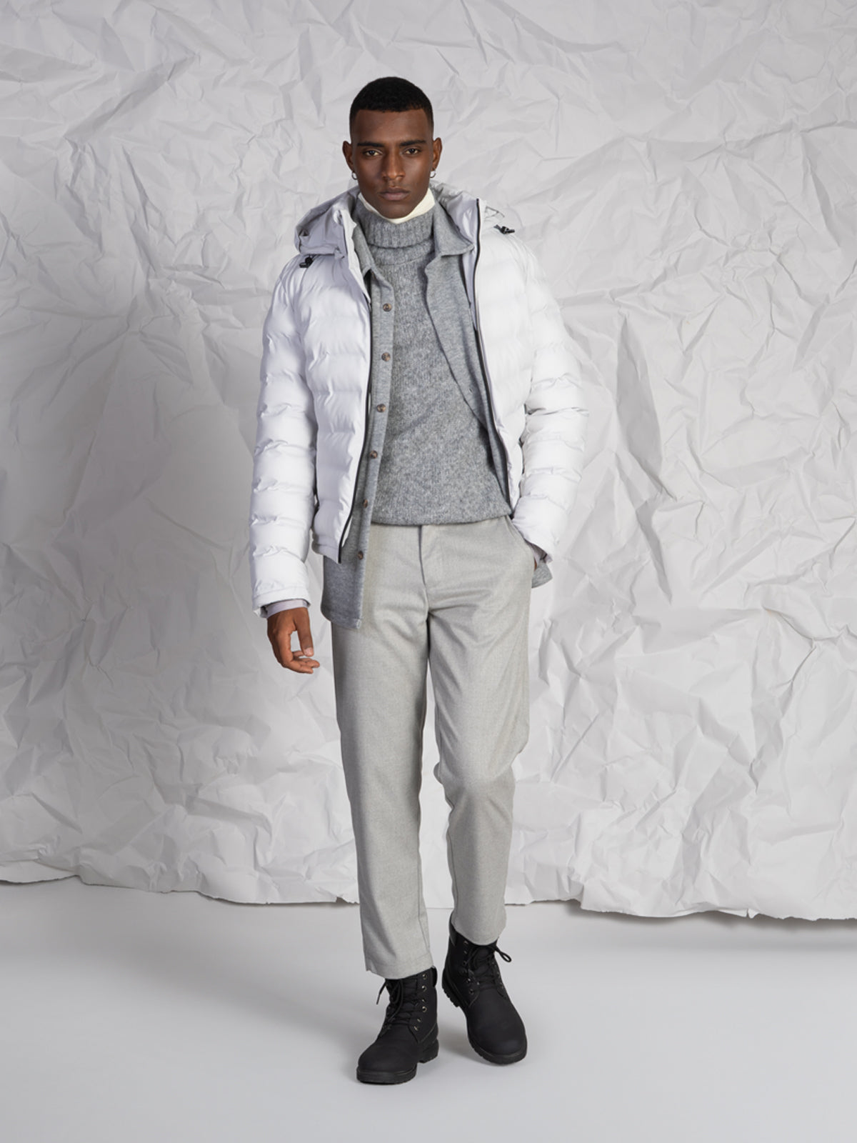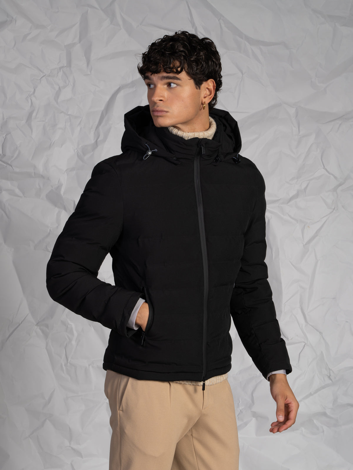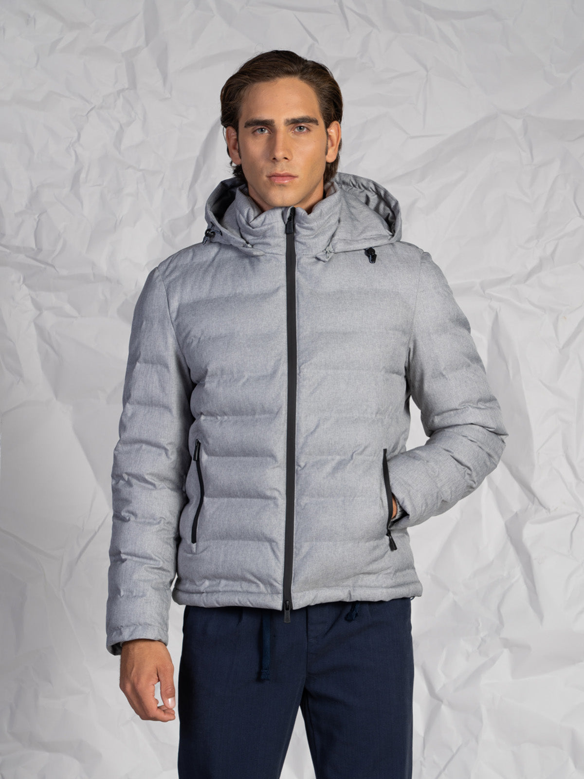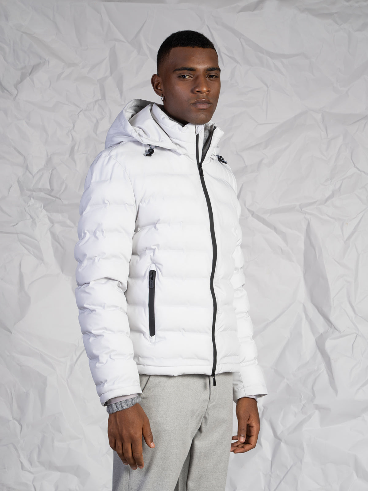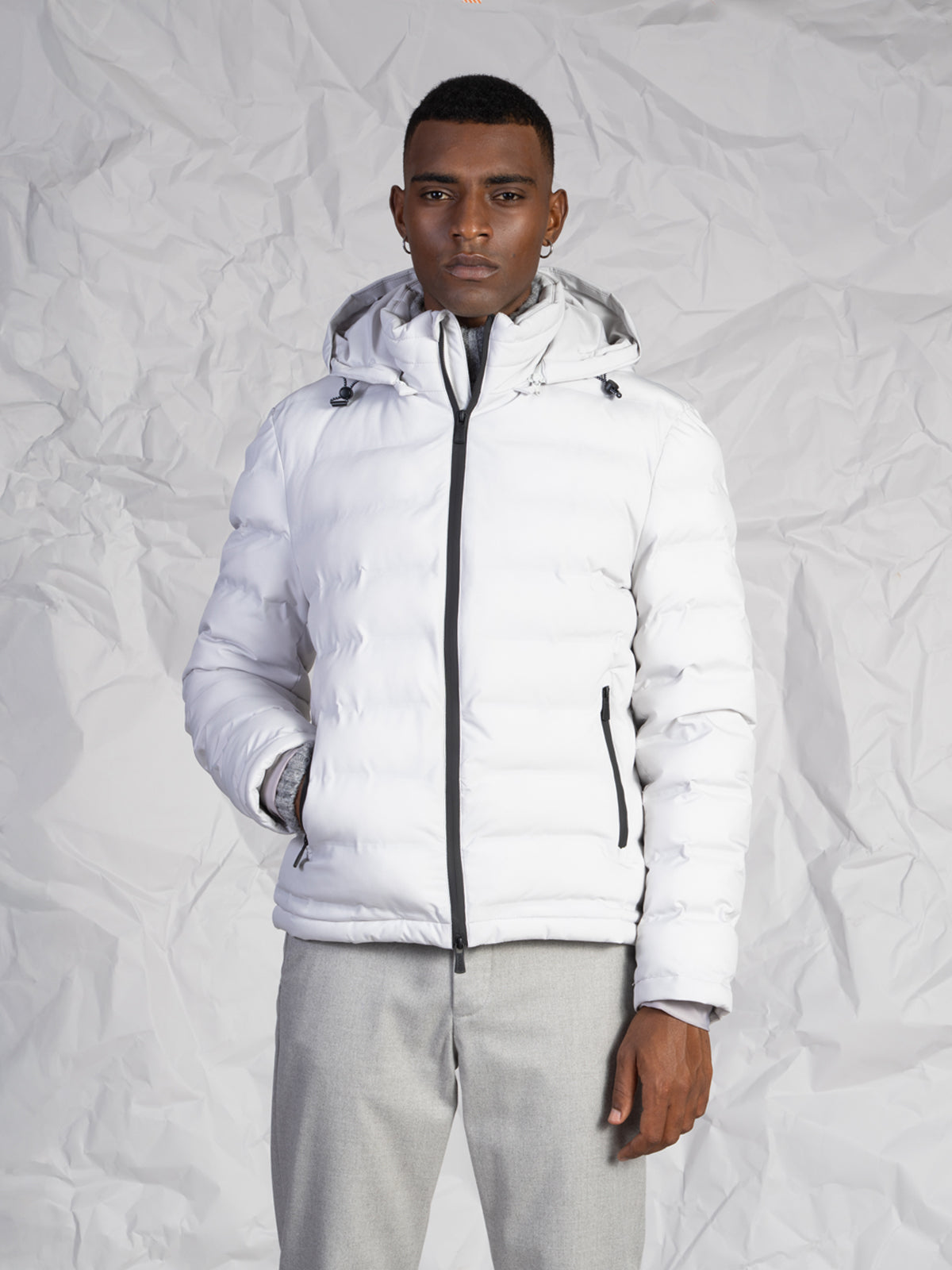 La chiusura frontale con zip rinforzata assicura durata e protezione, mentre le tasche laterali a filo con zip aggiungono funzionalità e praticità. Il cappuccio rimovibile con zip permette di adattare il capo alle diverse condizioni climatiche e agli stili di ogni giorno.
